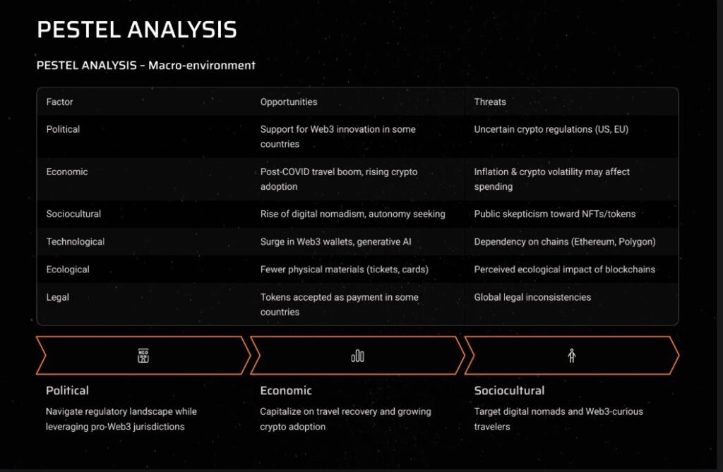 - Opportunités : boom du nomadisme digital, adoption croissante des crypto-portefeuilles, post-COVID rebound