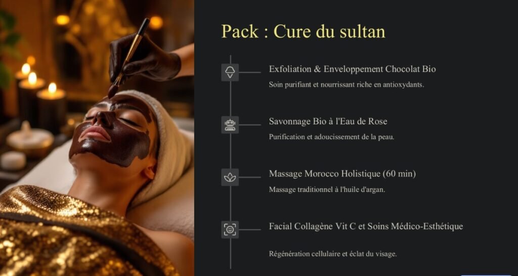 • Comprend : hammam bio, massage à l’huile d’argan, facial collagène, salon VIP